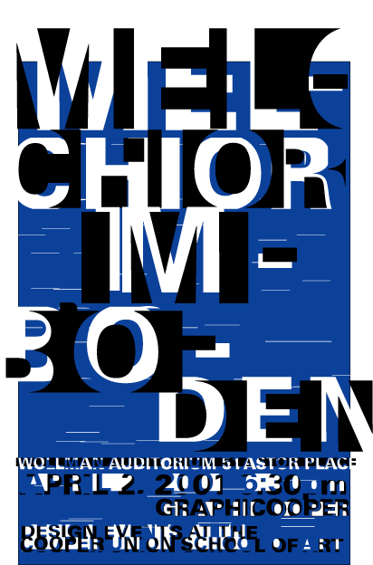 I created this poster to advertise a lecture at Cooper Union by Swiss Designer Melchior Imboden. He spoke as part of a lecture series titled Graphicooper. I wanted to design the poster in his style, which uses type as geometric forms of composition while also conveying information. Melchior Imboden liked this poster so much that it is now part of his personal collection.