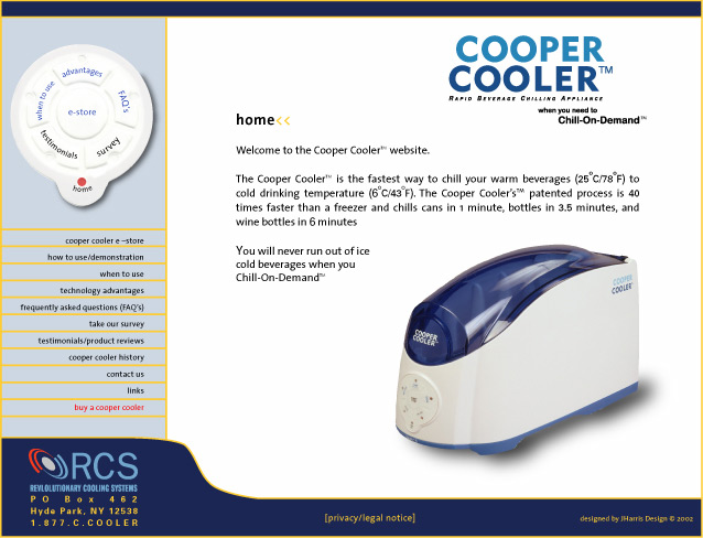 I created this site for Revolutionary Cooling Systems to serve as both an advertisement and e-commerce store for the Cooper Cooler. My idea for the site was to take the touch pad/controller from the actual Cooper Cooler unit and use it as the main navigation for the website. I wanted to use cool colors for the site to create a cold feeling, because the Cooper Cooler is a beverage chilling device. It is a fully functional e-store and can be viewed at www.coopercooler.com