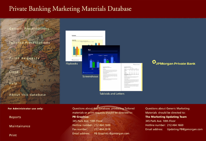 This was a design I created for the JPMorgan Private Bank Marketing Materials Database. The database serves as the intermediary between the banker/analyst team and the presentation designers/updaters. When a banker wanted to give a presentation they would go to this database and submit a request. Because the database is known as the Global Marketing Database, part af the design requirement was that it contain iamges of maps and globes.