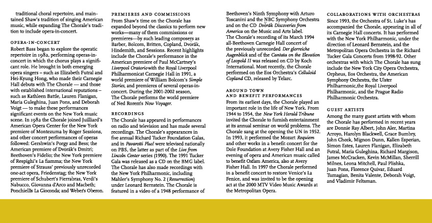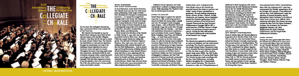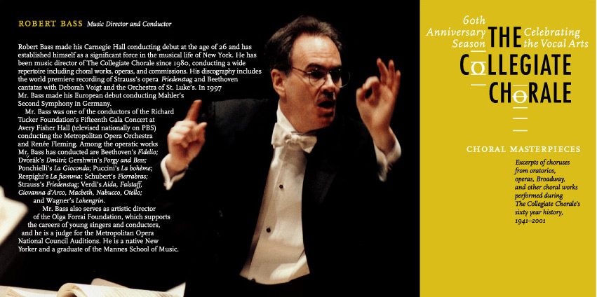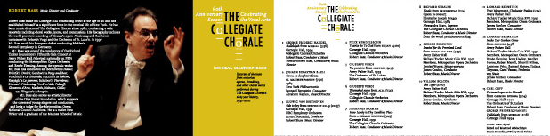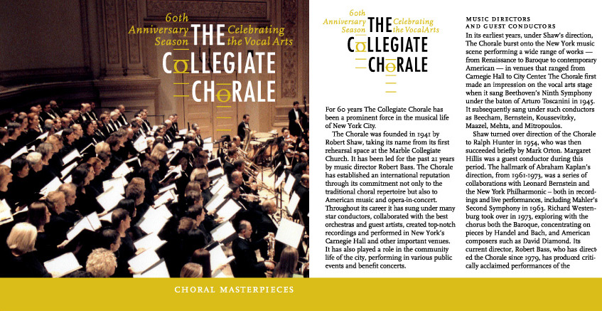 Below are the CD Cover and insert for the Collegiate Chorale’s 60th Anniversary Season CD. For this CD the Collegiate Chorale wished to focus on Robert Bass’ achievements in leading the chorale forward as Conductor.